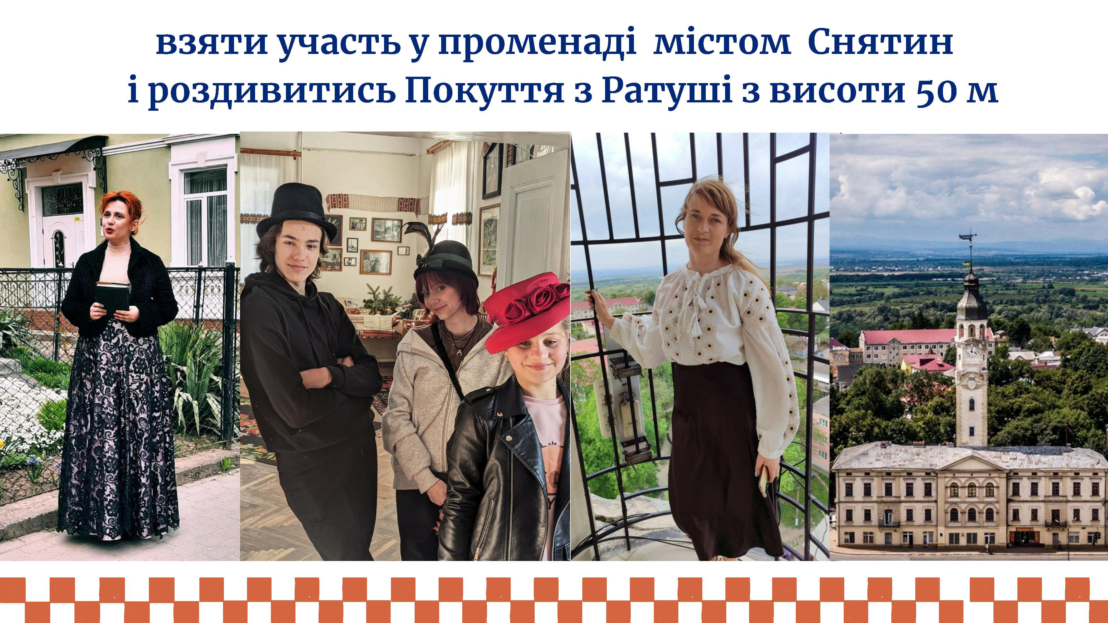 Променад Снятином - це знати, що у кожного будинку є душа. Душа свого часу. Це загадковий маєток з кімнатою без вікон і красива ратуша з «капсулою часу». Це традиція з міським колоритом. Це музеї, кожен з яких має свій характер. Снятин - це завжди дуже делікатна мандрівка. Променад між часами».