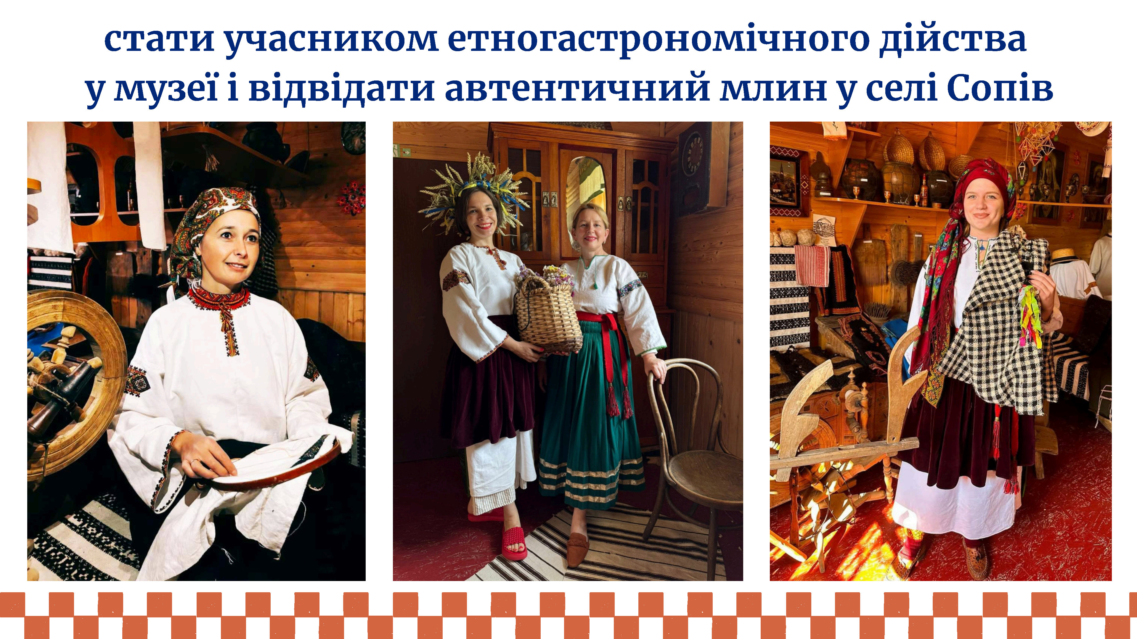 «Більше двадцяти років я працюю у сфері культури села Сопів. У нас є свій краєзнавчий музей - невеликий, але дуже душевний. Тут кожна річ має свою історію. Упродовж цих років я організувала тут безліч заходів: свята фольклору, етнографічні посиденьки, гастротури по приготуванні давніх страв, відтворення свят, які притаманні нашому селу. Поруч із музеєм розташований стародавній автентичний млин, який теж рекомендую відвідати нашим гостям. У музеї та біля млина екскурсанти мають чудову можливість не лише пізнати історію, а й створити особливі спогади. Тут можна організувати фотосесію в етностилі. Вишиванки, авторські аксесуари та природне тло допоможуть передати красу українських традицій і створити по-справжньому душевні кадри».