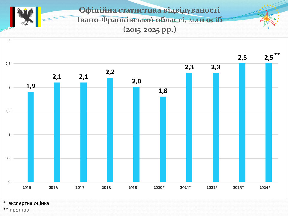 Кількість відвідувачів Івано-Франківської області у 2024 р. становить 2,5 млн осіб. За прогнозами Прикарпаття у 2025 р. відвідає понад 2,5 млн осіб.