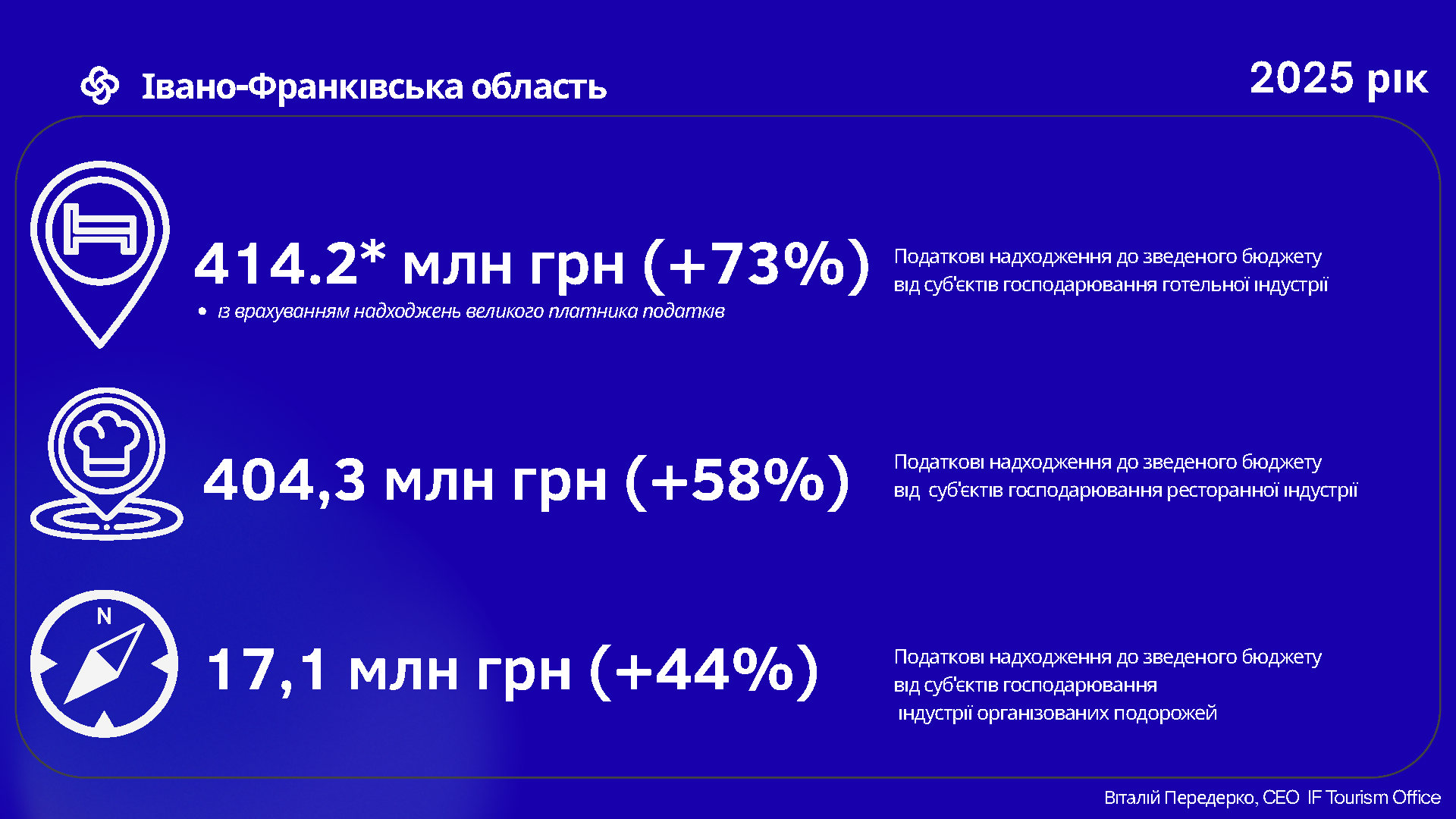 За даними інформаційних баз ДПС України податкові надходження до зведеного бюджету від суб'єктів господарювання сфери туризму Івано-Франківської області за 2025 р. становлять 431,3 млн грн (+72%).